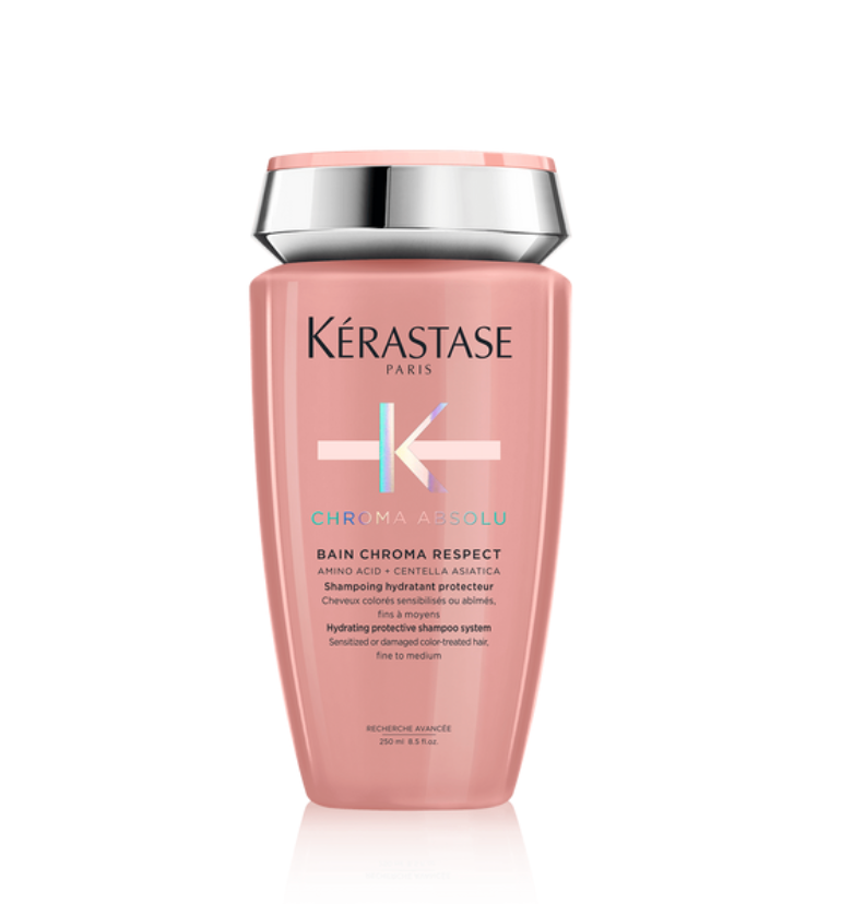 Bain Chroma Respect es un shampoo protector, suave e hidratante para todo tipo de cabello sensibilizado, teñido y dañado, adaptado para cabello fino y medio. Esta cremosa textura rosa hidrata profundamente y cuida la fibra capilar mientras respeta y preserva el color. Enriquecida con una combinación potente de Aminoácido y Centella Asiática, este avanzado shampoo penetra en el centro de la fibra para un cabello más fuerte y resiliente. El cabello es sublimado con 74% más brillo*, más hidratación y reduce la porosidad para un incremento de retención del color. La fibra capilar se mantiene tan saludable que 92% de la intensidad del color se preserva incluso después de 6 semanas**. Esta fórmula es libre de sulfatos, siliconas y parabenos. 9 de cada 10 mujeres coincide en que Bain Chroma Respect es suave con el cabello***.